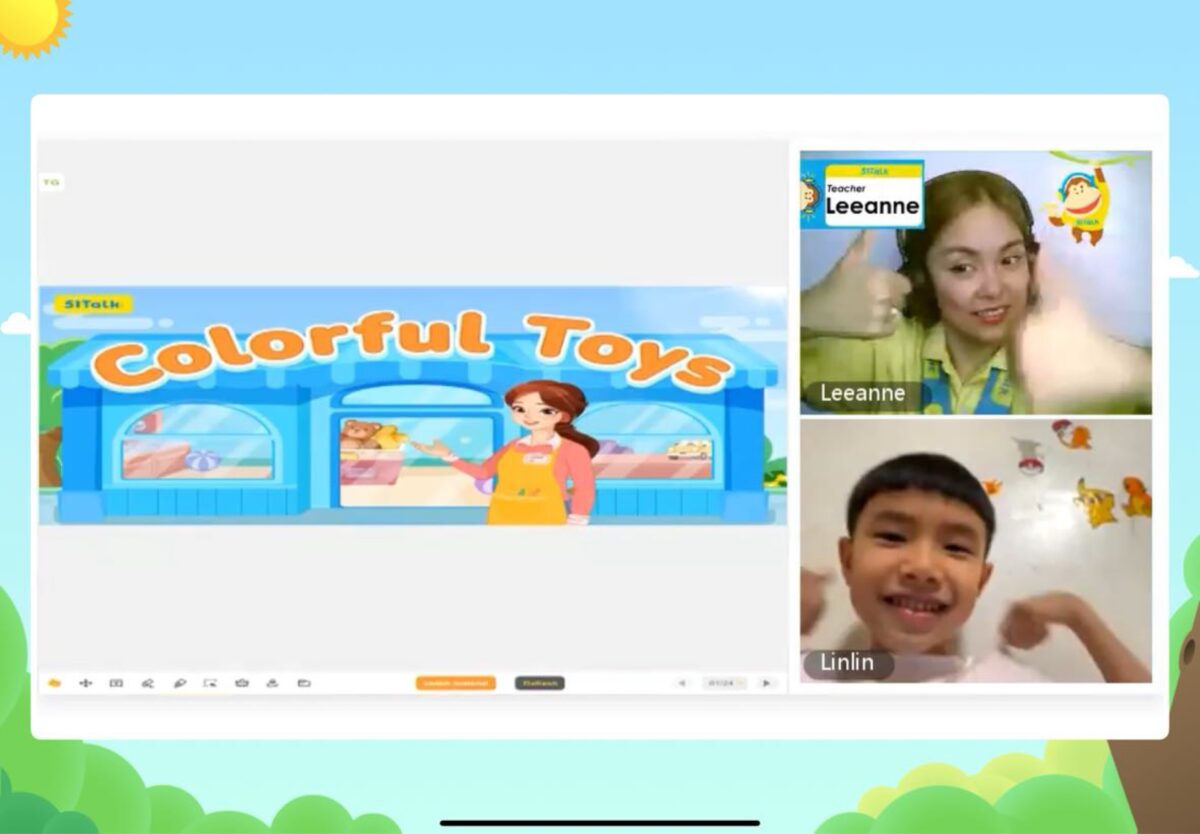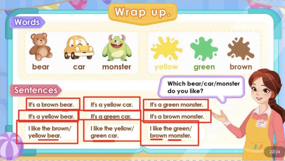 第二堂課更讓林林興奮,因為主題是孩子最愛的玩具!「colorful toys」,出現各種玩具:bear(泰迪熊)、car(汽車)、monster(怪獸),林林邊看邊忍不住笑。螢幕上出現 :黃色的小汽車、綠色的怪獸、棕色的泰迪熊。老師運用顏色與玩具結合,「This is a yellow car.」「That is a green monster.」,林林甚至還拿出自己的小汽車,跟老師展示。老師立刻用英文稱讚他:「Wow! A car! Good boy!」。林林在遊戲互動中學會了形容詞+名詞的用法,還會跟著比手勢。